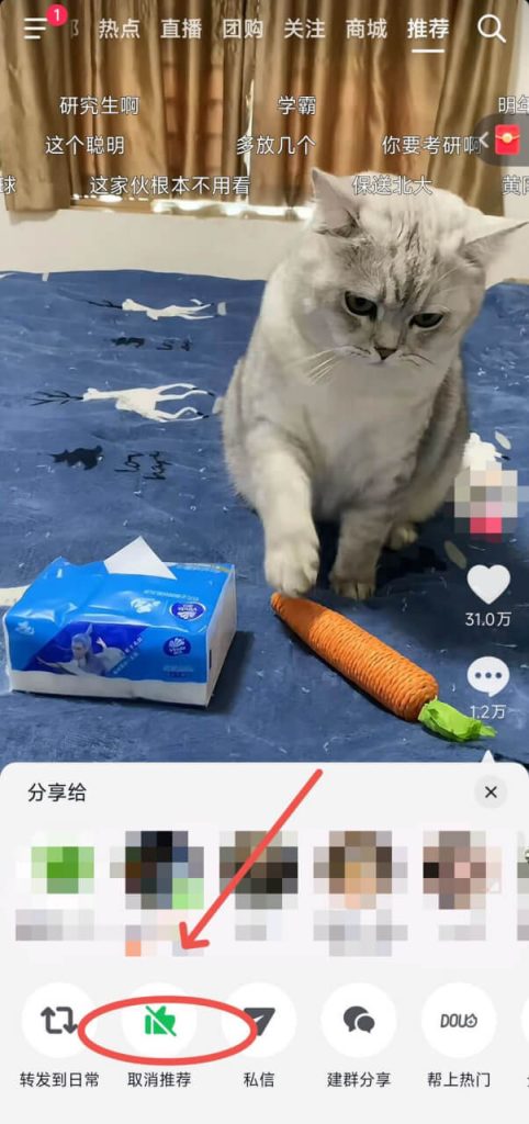 2. 点击“移除转发”:弹出菜单中可见绿色点赞按钮‘取消推荐’(与原“推荐”按钮相同)。