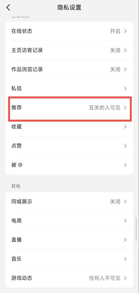 3. 进入隐私设置: 找到“推荐”选项。